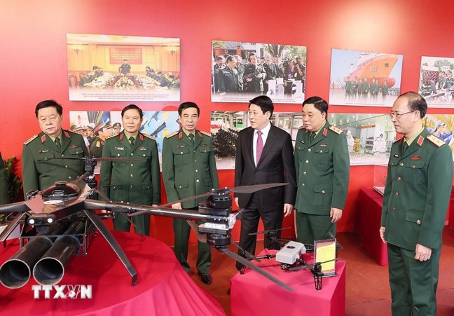 | Chủ tịch nước Lương Cường và đại biểu tham quan trưng bày khí tài, thiết bị quân sự do Tổng cục Công nghiệp Quốc phòng sản xuất. (Ảnh: Lâm Khánh/TTXVN) |
