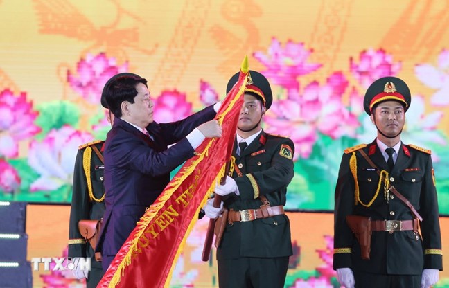| Chủ tịch nước Lương Cường trao danh hiệu Thành phố Anh hùng cho Đảng bộ, chính quyền và nhân dân Thành phố Hải Phòng. Ảnh: Lâm Khánh/TTXVN |