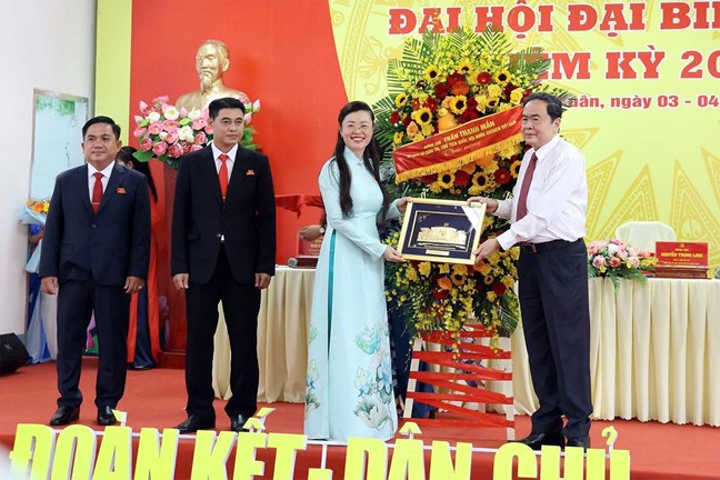 | Chủ tịch Quốc hội Trần Thanh Mẫn tặng hoa, biểu trưng Nhà Quốc hội chúc mừng Đại hội. Ảnh: Báo Đại biểu nhân dân |