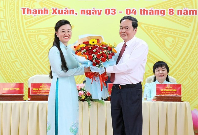 | Chủ tịch Quốc hội Trần Thanh Mẫn chúc mừng Bí thư Đảng ủy xã Thạnh Xuân Phạm Thị Thùy Dung. Ảnh: Báo Đại biểu nhân dân |