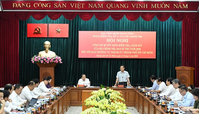 (Mặt trận) - Chiều 14/3, tại Thành phố Hồ Chí Minh, Ủy viên Bộ Chính trị, Bí thư Đảng ủy Quốc hội, Chủ tịch Quốc hội Trần Thanh Mẫn, Trưởng Đoàn Kiểm tra, giám sát của Bộ Chính trị, Ban Bí thư năm 2026 (Đoàn Kiểm tra, giám sát số 11) và Ủy viên Bộ Chính trị, Bí thư Thành ủy Thành phố Hồ Chí Minh Trần Lưu Quang, đồng chủ trì Hội nghị công bố quyết định kiểm tra, giám sát của Bộ Chính trị, Ban Bí thư và làm việc với Ban Thường vụ Thành ủy Thành phố Hồ Chí Minh.