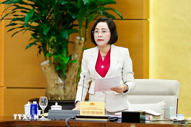 | Phó Chủ tịch Quốc hội Nguyễn Thị Thanh - Phó Chủ tịch Thường trực Hội đồng Bầu cử quốc gia kiêm Trưởng Tiểu ban Nhân sự Hội đồng Bầu cử quốc gia phát biểu tại Phiên họp. Ảnh: TTXVN |