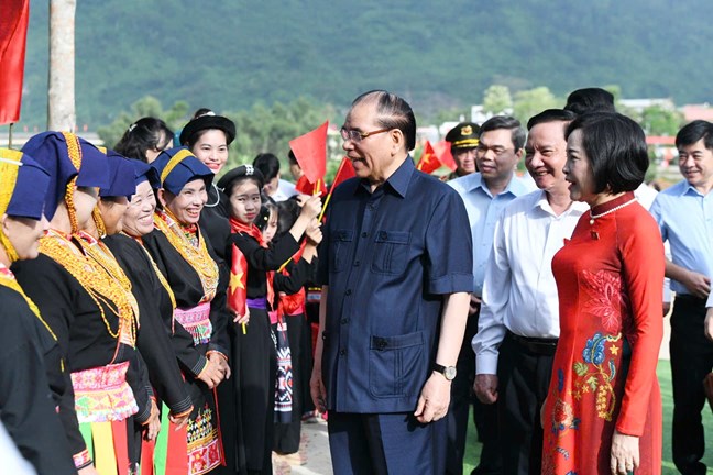 | Nguyên Tổng Bí thư Nông Đức Mạnh và các Ủy viên Trung ương Đảng: Phó Chủ tịch Quốc hội Nguyễn Khắc Định; Phó Chủ tịch Quốc hội Nguyễn Thị Thanh với Nhân dân tỉnh Tuyên Quang. Ảnh: Lâm Hiển |