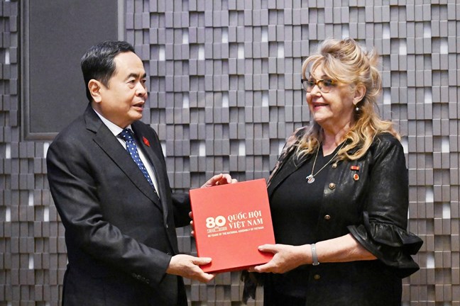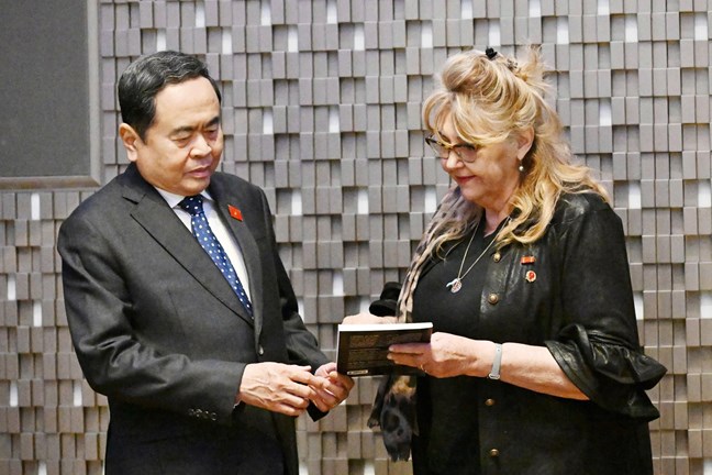 | Chủ tịch Quốc hội Trần Thanh Mẫn trao tặng Lãnh sự danh dự Sandra Scagliotti cuốn sách về 80 năm Quốc hội Việt Nam. Ảnh: Dương Dung |