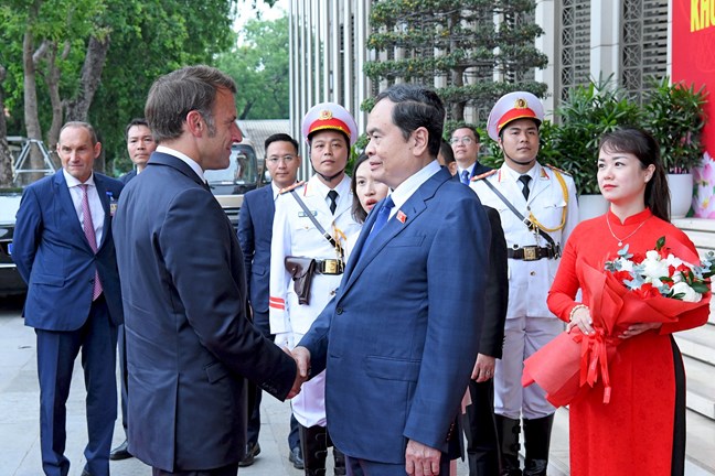 | Chủ tịch Quốc hội Trần Thanh Mẫn đón Tổng thống Cộng hòa Pháp Emmanuel Macron. Ảnh: Lâm Hiển |
