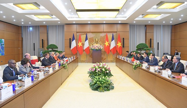 Tổng thống Emmanuel Macron đánh giá cao vai trò của Quốc hội Việt Nam trong việc củng cố quan hệ hữu nghị và hợp tác nhiều mặt với Pháp; đề nghị tăng cường hợp tác giữa Nghị viện hai nước, đặc biệt trong việc tạo điều kiện phê chuẩn các thoả thuận, hiệp định song phương...