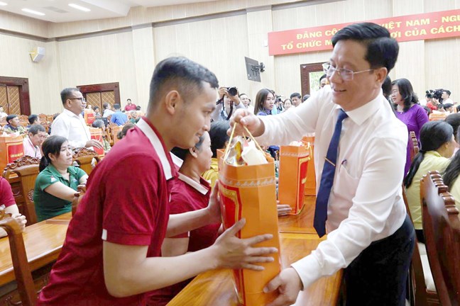 | Ủy viên Trung ương Đảng, Bí thư Tỉnh ủy An Giang Nguyễn Tiến Hải trao quà tặng công nhân, người lao động có hoàn cảnh khó khăn |
