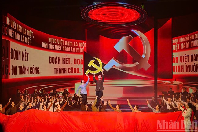 | Một tiết mục trong chương trình nghệ thuật chính luận “Mãi mãi niềm tin theo Đảng” chào mừng Đại hội XIV. (Ảnh: BẢO LONG) |