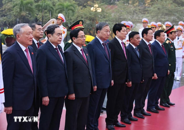 Sáng 19/1, trước giờ khai mạc phiên họp trù bị Đại hội đại biểu toàn quốc lần thứ XIV của Đảng, các đồng chí Ủy viên Bộ Chính trị: Tổng Bí thư Tô Lâm, Chủ tịch nước Lương Cường, Thủ tướng Chính phủ Phạm Minh Chính, Chủ tịch Quốc hội Trần Thanh Mẫn, Thường trực Ban Bí thư Trần Cẩm Tú; Bí thư Trung ương Đảng, Chủ tịch Ủy ban Trung ương Mặt trận Tổ quốc Việt Nam Bùi Thị Minh Hoài cùng các đồng chí Ủy viên Bộ Chính trị, Bí thư Trung ương Đảng và đại biểu dự Đại hội đại biểu toàn quốc lần thứ XIV của Đảng đã đặt hoa, vào Lăng viếng Chủ tịch Hồ Chí Minh - Người sáng lập và rèn luyện Đảng ta, lãnh tụ vĩ đại của Đảng và dân tộc Việt Nam.
