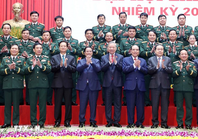 | Tổng Bí thư Tô Lâm, Thủ tướng Phạm Minh Chính, Chủ tịch Quốc hội Trần Thanh Mẫn với các đại biểu dự đại hội. Ảnh: Trọng Đức/TTXVN |
