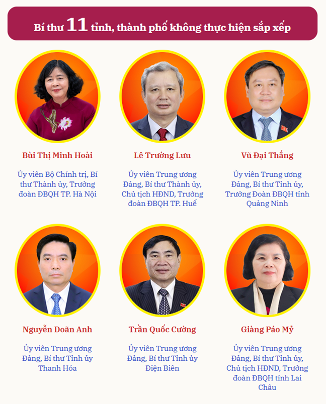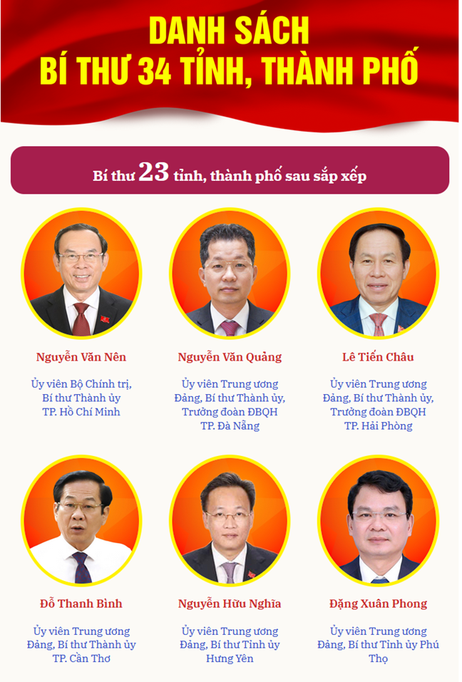 Sau đây là hình ảnh Bí thư 23 tỉnh, thành phố sau sắp xếp và 11 Bí thư các tỉnh, thành phố không thực hiện sắp xếp: