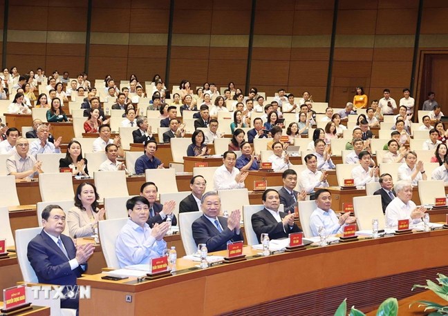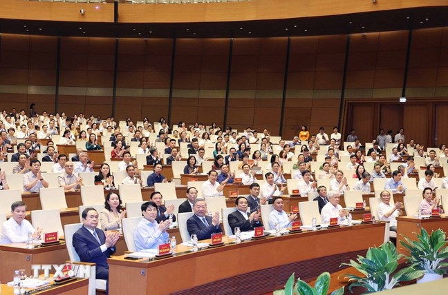| Tổng Bí thư Tô Lâm, Chủ tịch nước Lương Cường, Thủ tướng Phạm Minh Chính, Chủ tịch Quốc hội Trần Thanh Mẫn cùng các lãnh đạo Đảng, Nhà nước; lãnh đạo các Ban, bộ, ngành dự hội nghị tại điểm cầu chính Hội trường Diên Hồng, Nhà Quốc hội. (Ảnh: Thống Nhất/TTXVN) |