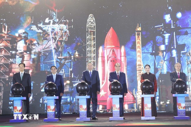 | Tổng Bí thư Tô Lâm, Thủ tướng Phạm Minh Chính cùng các đồng chí Lãnh đạo, nguyên Lãnh đạo Đảng, Nhà nước thực hiện nghi thức khai mạc Triển lãm thành tựu Đất nước. Ảnh: Thống Nhất/TTXVN |