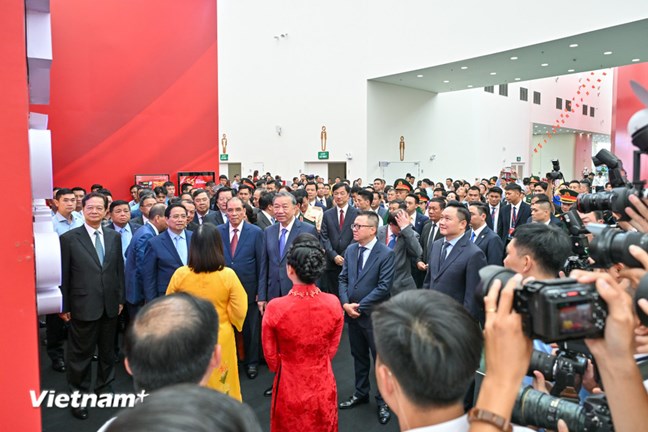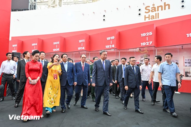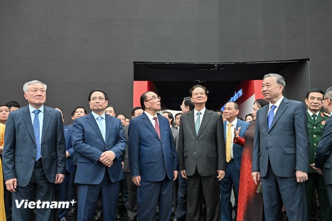 | Tổng Bí thư Tô Lâm, Thủ tướng Phạm Minh Chính cùng các đồng chí Lãnh đạo, nguyên Lãnh đạo Đảng, Nhà nước tại Triển lãm thành tựu Đất nước. Ảnh: Thống Nhất/TTXVN |