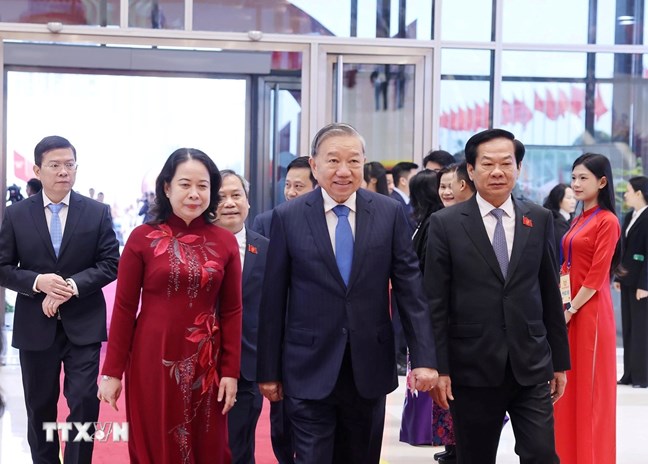 | Tổng Bí thư Ban Chấp hành Trung ương Đảng Cộng sản Việt Nam Tô Lâm; Ủy viên Bộ Chính trị, Bí thư Trung ương Đảng, Chủ tịch Ủy ban Trung ương Mặt trận Tổ quốc Việt Nam Bùi Thị Minh Hoài, Phó Chủ tịch Hội đồng Thi đua-Khen thưởng Trung ương đến dự Đại hội Thi đua yêu nước toàn quốc lần thứ XI. (Ảnh: TTXVN) |