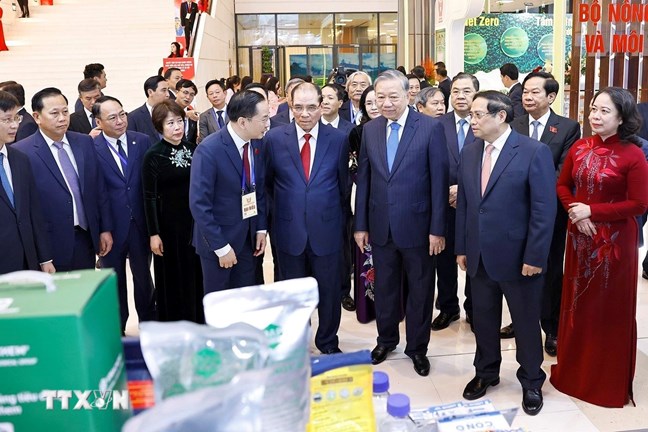 | Tổng Bí thư Ban Chấp hành Trung ương Đảng Cộng sản Việt Nam Tô Lâm; nguyên Tổng Bí thư Nông Đức Mạnh; Ủy viên Bộ Chính trị, Thủ tướng Chính phủ Phạm Minh Chính, Chủ tịch Hội đồng Thi đua-Khen thưởng Trung ương; Ủy viên Bộ Chính trị, Bí thư Trung ương Đảng, Chủ tịch Ủy ban Trung ương Mặt trận Tổ quốc Việt Nam Bùi Thị Minh Hoài, Phó Chủ tịch Hội đồng Thi đua-Khen thưởng Trung ương cùng các đại biểu tham quan khu vực triển lãm tại Đại hội. (Ảnh: TTXVN) |