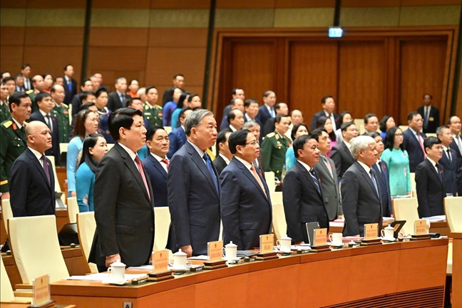 | Tổng Bí thư Tô Lâm, Chủ tịch nước Lương Cường, Thủ tướng Phạm Minh Chính, Thường trực Ban Bí thư Trần Cẩm Tú và các đại biểu Quốc hội dự Kỳ họp thứ Mười. Ảnh: Lâm Hiển |