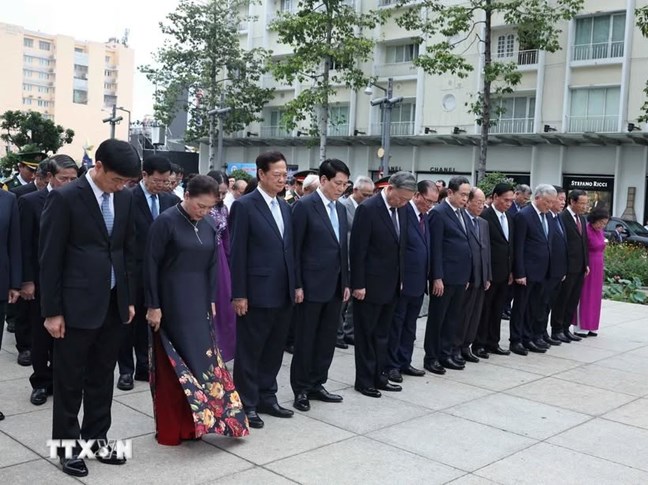 | Các đồng chí lãnh đạo, nguyên lãnh đạo Đảng Nhà nước thành kính tưởng niệm Chủ tịch Hồ Chí Minh tại Công viên Tượng đài Bác Hồ (Quận 1, Hồ Chí Minh). (Ảnh: Thống Nhất/TTXVN) |