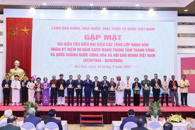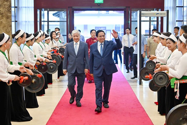| Thủ tướng Chính phủ Phạm Minh Chính, Chủ tịch UBTƯ MTTQ Việt Nam Đỗ Văn Chiến và các đại biểu tham dự chương trình gặp mặt. Ảnh: Quang Vinh. |