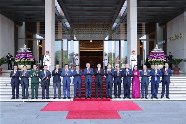 | Lãnh đạo Đảng, Nhà nước tại Nhà Quốc hội trước giờ khai mạc Kỳ họp thứ Mười, Quốc hội khóa XV. Ảnh: Hồ Long |