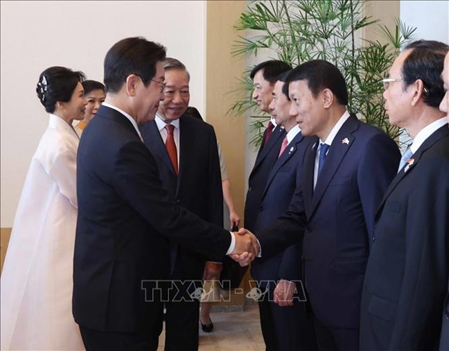 | Tổng Bí thư Tô Lâm giới thiệu thành viên đoàn Việt Nam với Tổng thống Hàn Quốc Lee Jae Myung và Phu nhân. Ảnh: Thống Nhất/TTXVN |