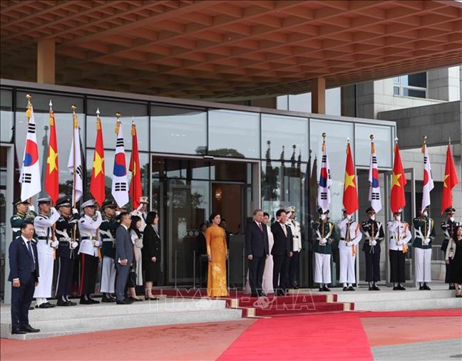 | Lễ đón Tổng Bí thư Tô Lâm và Phu nhân tại Phủ Tổng thống ở Thủ đô Seoul. Ảnh: Thống Nhất/TTXVN |