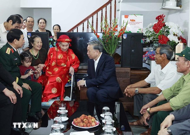 | Tổng Bí thư Tô Lâm thăm hỏi mẹ liệt sỹ Phạm Thị Cuông, xã Hoàng Hoa Thám, tỉnh Hưng Yên. (Ảnh: Thống Nhất/TTXVN) |