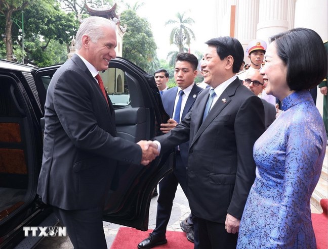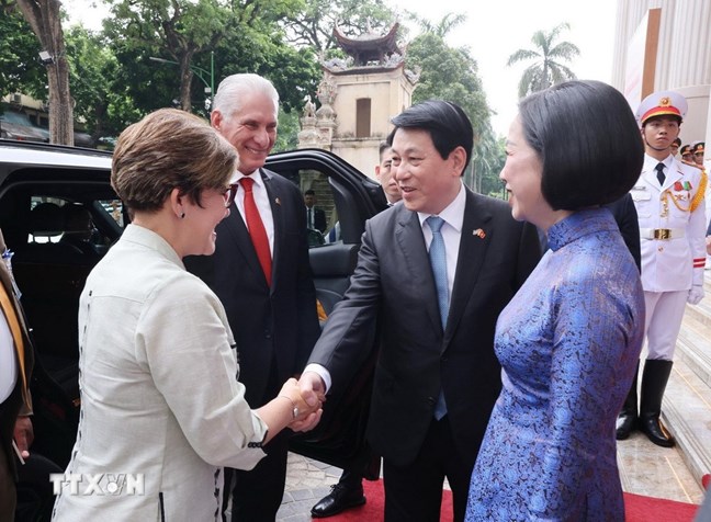 | Chủ tịch nước Lương Cường và Phu nhân đón Bí thư thứ Nhất, Chủ tịch nước Cộng hòa Cuba Miguel Díaz-Canel Bermúdez và Phu nhân dự Lễ kỷ niệm 60 năm thiết lập quan hệ ngoại giao Việt Nam - Cuba. Ảnh: Lâm Khánh/TTXVN |