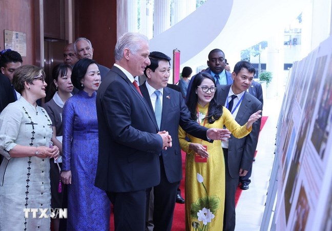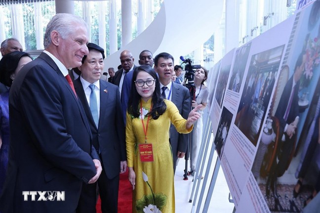 | Chủ tịch nước Lương Cường và Phu nhân cùng Bí thư thứ Nhất Ban Chấp hành Trung ương Đảng Cộng sản Cuba, Chủ tịch nước Cộng hòa Cuba Miguel Díaz-Canel Bermúdez và Phu nhân xem trưng bày ảnh 60 năm thiết lập quan hệ ngoại giao Việt Nam - Cuba do Thông tấn xã Việt Nam thực hiện. Ảnh: Lâm Khánh/TTXVN |