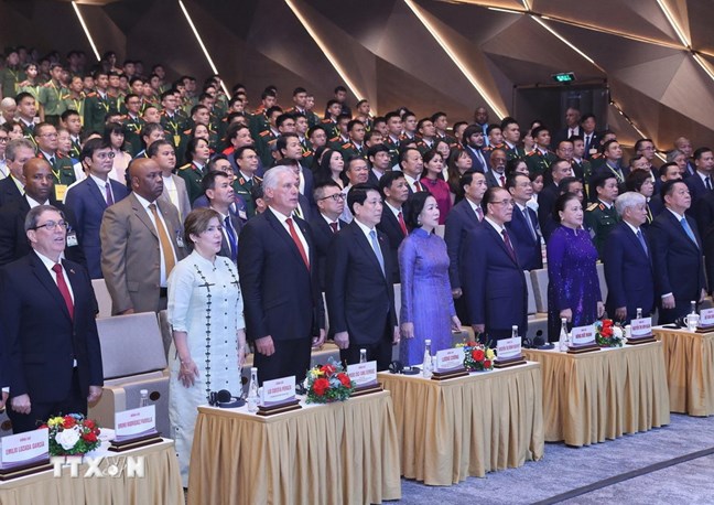 Về phần mình, thay mặt Đảng, Nhà nước và nhân dân Việt Nam, Chủ tịch nước nhiệt liệt chào mừng Bí thư thứ Nhất, Chủ tịch nước Cuba Miguel Diaz Canel và Phu nhân cùng các đại biểu, cùng toàn thể các bạn Cuba và Việt Nam tham dự Lễ kỷ niệm đặc biệt có ý nghĩa này.