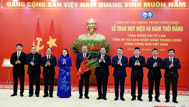 "Tấm huy hiệu 45 năm tuổi Đảng hôm nay là sự ghi nhận xứng đáng của Đảng, Nhà nước đối với những cống hiến đặc biệt xuất sắc của đồng chí Tổng Bí thư Tô Lâm. Đây không chỉ là niềm tự hào của cá nhân và gia đình đồng chí, mà còn là niềm vui chung của toàn Đảng chúng ta", Thường trực Ban Bí thư khẳng định.