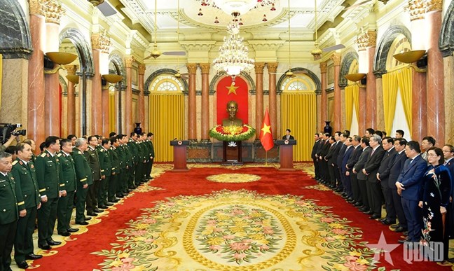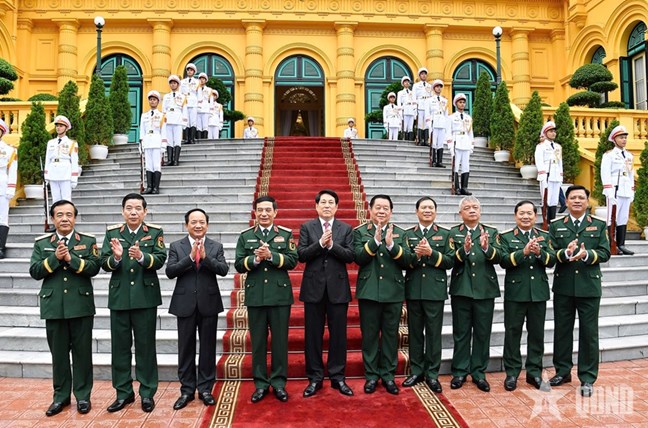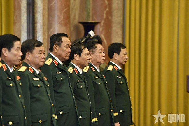 Đánh giá tình hình đó đang đặt ra những yêu cầu mới ngày càng cao đối với Lực lượng vũ trang trong nhiệm vụ xây dựng và bảo vệ Tổ quốc, Chủ tịch nước đề nghị các đồng chí vừa được bổ nhiệm, thăng quân hàm tiếp tục phát huy truyền thống vẻ vang của Quân đội nhân dân Việt Nam anh hùng và phẩm chất Bộ đội Cụ Hồ; tiếp tục giữ gìn đạo đức cách mạng, tuyệt đối trung thành với Đảng, Tổ quốc và nhân dân; đoàn kết, gắn bó máu thịt với cán bộ, chiến sĩ và nhân dân; tiếp tục học tập, tu dưỡng, rèn luyện để luôn xứng đáng là người lãnh đạo, chỉ huy tài năng, mẫu mực, nỗ lực phấn đấu, khắc phục khó khăn, thử thách, hoàn thành xuất sắc mọi nhiệm vụ mà Đảng, Nhà nước và nhân dân tin tưởng giao phó.