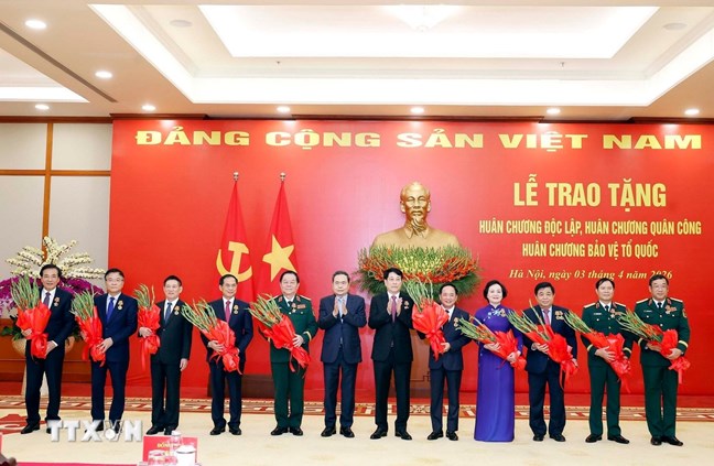 | Tổng Bí thư Tô Lâm trao tặng Huân chương Độc lập hạng Nhất cho đồng chí Phạm Minh Chính, Ủy viên Bộ Chính trị khóa XIII, Thủ tướng Chính phủ và Huân chương Quân công hạng Nhất cho các đồng chí: Đại tướng Lương Cường, Ủy viên Bộ Chính trị khóa XIII, Chủ tịch nước; Đại tướng Phan Văn Giang, Ủy viên Bộ Chính trị, Phó Bí thư Quân ủy Trung ương, Bộ trưởng Bộ Quốc phòng; Nguyễn Xuân Thắng, Ủy viên Bộ Chính trị khóa XIII, nguyên Giám đốc Học viện Chính trị quốc gia Hồ Chí Minh, Chủ tịch Hội đồng Lý luận Trung ương; Thượng tướng Trần Quang Phương, Ủy viên Trung ương Đảng khóa XIII, Phó Chủ tịch Quốc hội; Nguyễn Chí Dũng, Ủy viên Trung ương Đảng khóa XIII, Phó Thủ tướng Chính phủ. Ảnh: Thống Nhất/TTXVN |