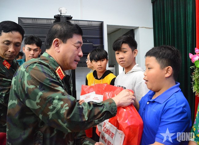 | Thượng tướng Trương Thiên Tô trao quà tặng các cháu nhỏ và người dân xã Tây Hòa |