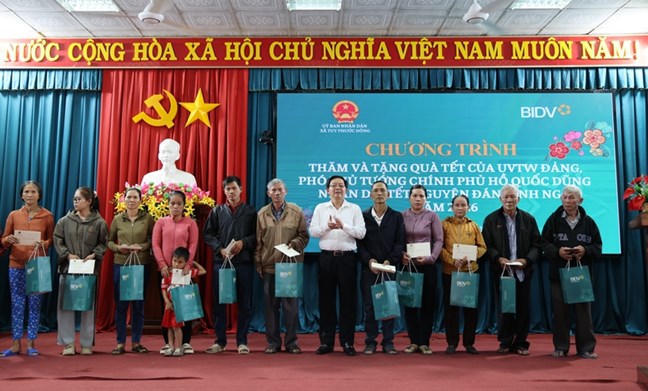 | Phó Thủ tướng và đoàn công tác chứng kiến Ngân hàng BIDV chi nhánh Bình Định trao 300 triệu đồng và 300 suất quà Tết cho người dân xã Tuy Phước Đông - Ảnh: VGP/Gia Huy |