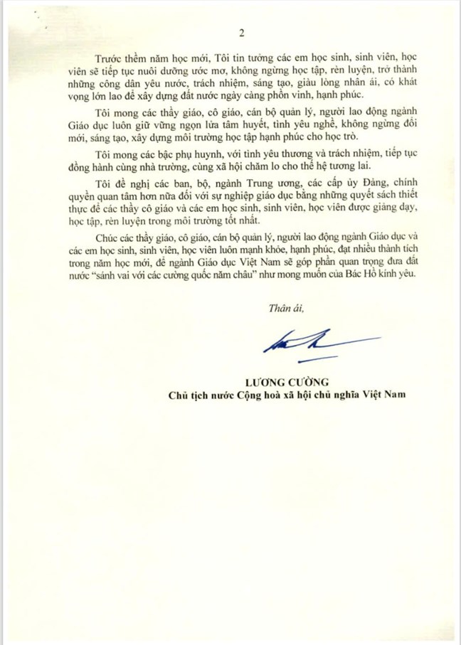 Trước thềm năm học mới, Tôi tin tưởng các em học sinh, sinh viên, học viên sẽ tiếp tục nuôi dưỡng ước mơ, không ngừng học tập, rèn luyện, trở thành những công dân yêu nước, trách nhiệm, sáng tạo, giàu lòng nhân ái, có khát vọng lớn lao để xây dựng đất nước ngày càng phồn vinh, hạnh phúc.