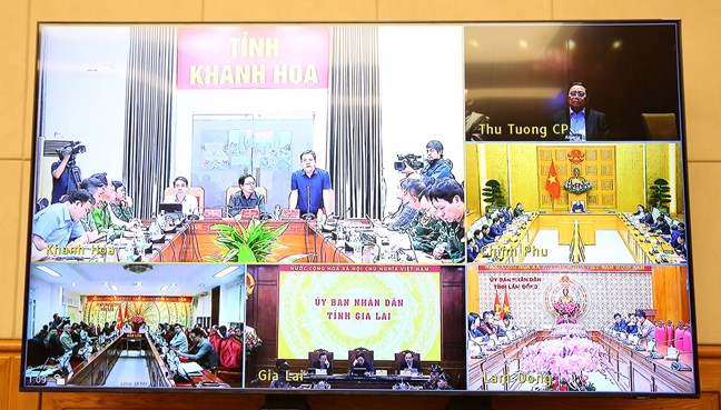 | Đầu cầu tỉnh Khánh Hòa có sự tham dự của Phó Thủ tướng Hồ Quốc Dũng; Bí thư tỉnh ủy Khánh Hòa Nghiêm Xuân Thành; Chủ tịch UBND tỉnh Trần Phong; đại diện Bộ NN&MT, Bộ Công an, Bộ Quốc phòng... - Ảnh VGP/Mai Anh |