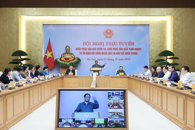 | Thủ tướng Phạm Minh Chính chủ trì hội nghị trực tuyến khắc phục hậu quả thiên tai, khôi phục sản xuất kinh doanh và ổn định đời sống nhân dân tại khu vực miền Trung - Ảnh: VGP/Nhật Bắc |