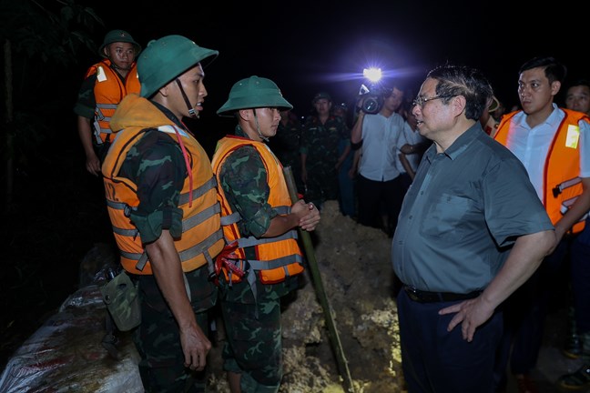 Đến động viên các lực lượng đang làm nhiệm vụ hộ đê, Thủ tướng cảm ơn các cán bộ, chiến sĩ đã làm xuyên đêm với tinh thần trách nhiệm cao nhất, khẩn trương nhất; đề nghị các lực lượng phân công nhiệm vụ hợp lý, có cách làm khoa học, hiệu quả nhất, kịp thời phát hiện, ứng phó, khắc phục kịp thời các sự cố dù nhỏ nhất ngay khi mới xảy ra.