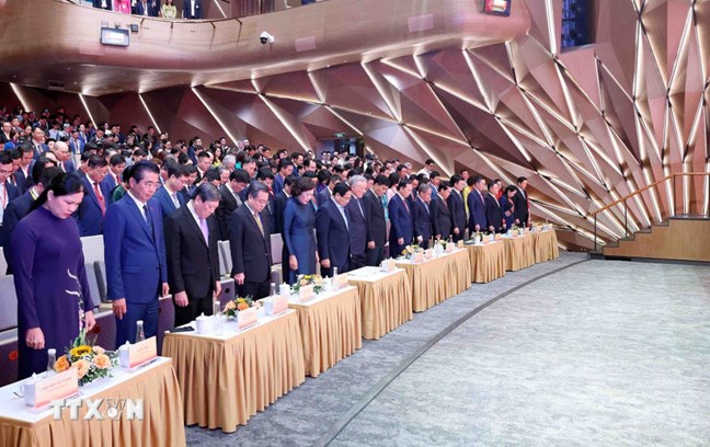 | Thủ tướng Phạm Minh Chính và các đại biểu dành phút tưởng niệm những nạn nhân thiệt mạng do bão lũ. Ảnh: Phạm Kiên/TTXVN |