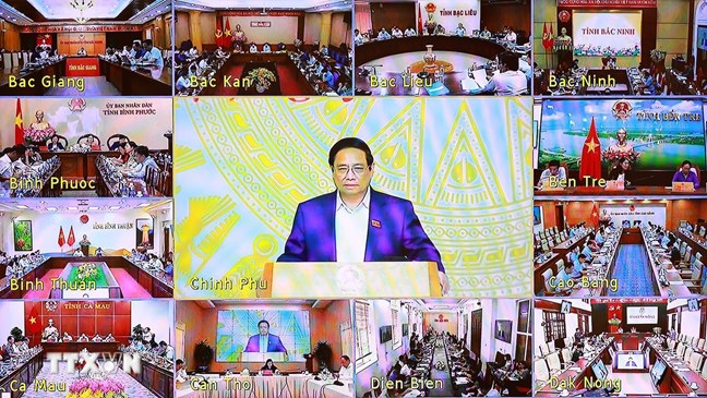 | Thủ tướng Phạm Minh Chính chủ trì Phiên họp lần thứ tư của Ban Chỉ đạo xóa nhà tạm, nhà dột nát trực tuyến đến các địa phương. (Ảnh: Dương Giang/TTXVN) |