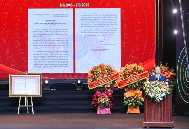 | Ông Đỗ Tiến Sỹ, Tổng Giám đốc VOV đọc Thư chúc mừng của Tổng Bí thư Tô Lâm nhân dịp kỷ niệm 80 năm Ngày thành lập Đài Tiếng nói Việt Nam - Ảnh: VGP/Nhật Bắc |