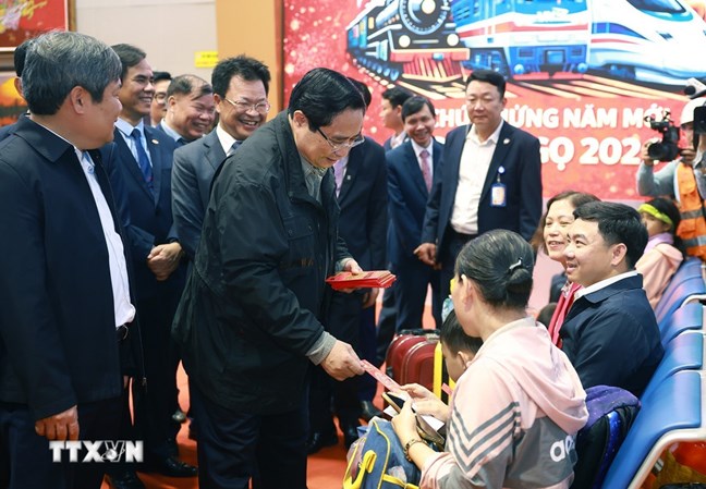 | Thủ tướng Phạm Minh Chính đến thăm, chúc Tết và kiểm tra công tác phục vụ hành khách tại Ga Hà Nội. Ảnh: Dương Giang/TTXVN |