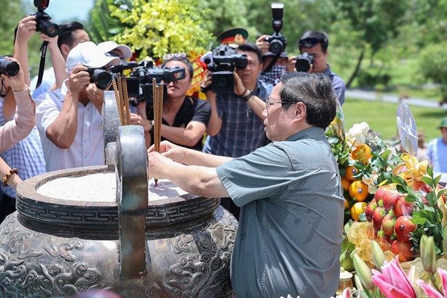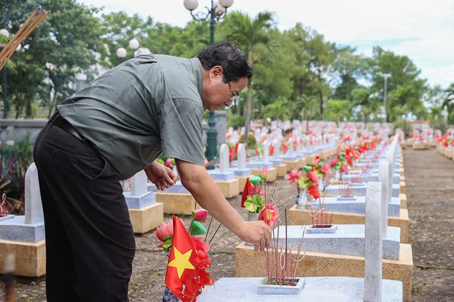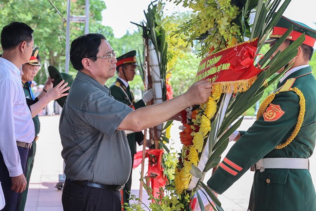 Tại Nghĩa trang Liệt sĩ quốc gia Đường 9 ở phường Đông Hà - nơi yên nghỉ vĩnh hằng của hơn 10.800 anh hùng liệt sĩ, Thủ tướng Phạm Minh Chính và Đoàn công tác bày tỏ lòng biết ơn vô hạn, sự tri ân sâu sắc đối với công lao to lớn của các anh hùng liệt sĩ đã hiến trọn tuổi thanh xuân, dũng cảm chiến đấu, hy sinh trên mặt trận Đường 9 và ở nước bạn Lào trong suốt cuộc kháng chiến chống Mỹ, cứu nước giành độc lập dân tộc cũng như hy sinh trong quá trình xây dựng và bảo vệ Tổ quốc.