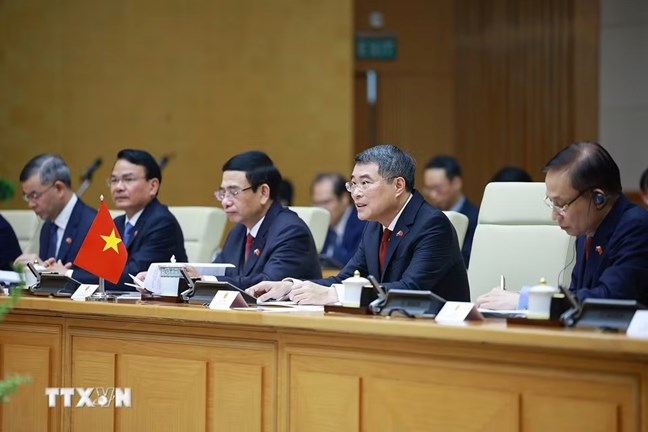 Thủ tướng Lê Minh Hưng và đoàn Việt Nam tại cuộc hội đàm với Thủ tướng Slovakia Robert Fico (Ảnh: Dương Giang/TTXVN)