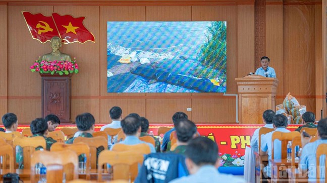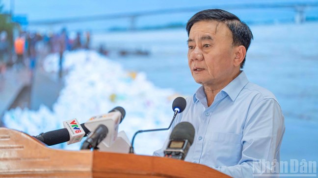 | Thường trực Ban Bí thư Trần Cẩm Tú động viên các lực lượng nỗ lực vượt qua khó khăn, khắc phục tạm thời bờ kè An Lương. |