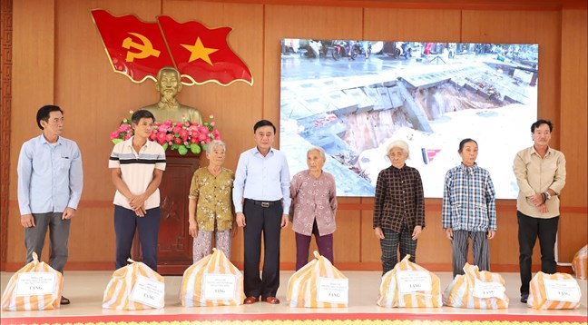 | Thường trực Ban Bí thư Trần Cẩm Tú trao quà các hộ dân bị ảnh hưởng bởi mưa lũ tại địa bàn xã Duy Nghĩa. |