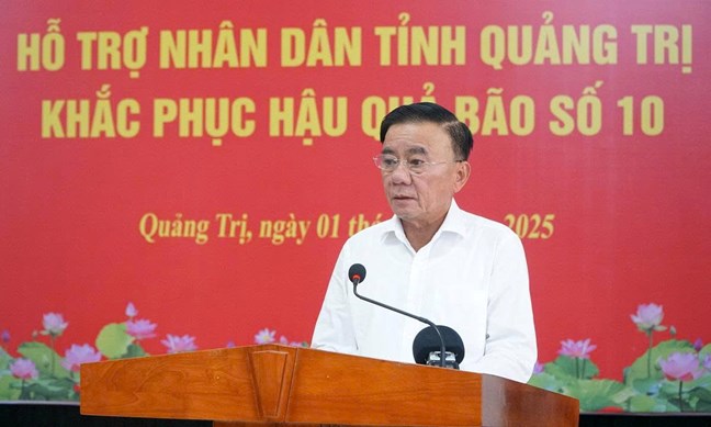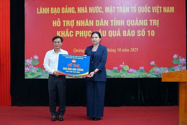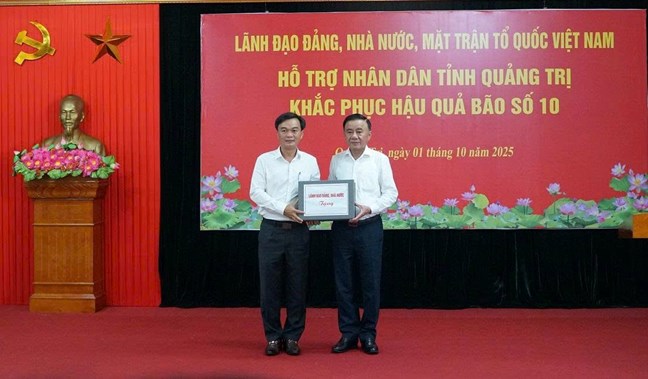 Nhân dịp này, Thường trực Ban Bí thư Trần Cẩm Tú trao quà hỗ trợ của Lãnh đạo Đảng, Nhà nước; Phó Chủ tịch Uỷ ban Trung ương Mặt trận Tổ quốc Việt Nam Hà Thị Nga, đại diện các nhà tài trợ, doanh nghiệp đã trao hỗ trợ tỉnh Quảng Trị khắc phục hậu quả do bão số 10 gây ra./.