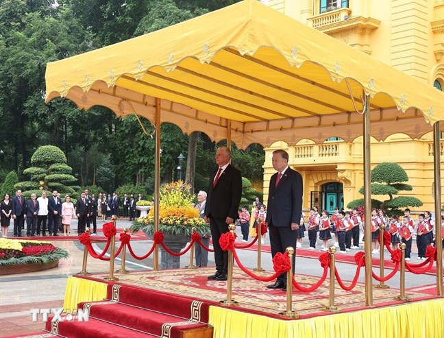 | Tổng Bí thư Tô Lâm và Bí thư thứ Nhất, Chủ tịch nước Cuba Miguel Díaz-Canel Bermúdez trên bục danh dự, nghe Quân nhạc cử Quốc thiều hai nước. Ảnh: Thống Nhất/TTXVN |