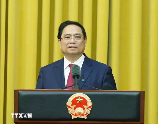 | Đồng chí Phạm Minh Chính, nguyên Ủy viên Bộ Chính trị, nguyên Thủ tướng Chính phủ nhiệm kỳ 2021 - 2026 phát biểu - Ảnh: TTXVN |